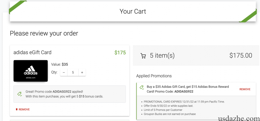 Groupon gift card 囤adidas 礼品卡了,买$35送$15,相当于$35买了$50的Adidas的礼品卡,7折囤礼品卡。相当划算,每个用户限购5张,优惠9月30结束,注意送的$15礼品卡12月31号之前需要用掉。可以在网上使用,也可以在实体店,奥莱店使用。活动链接,进入Groupon的e-gift网站或者输入优惠码:ADIDASG922