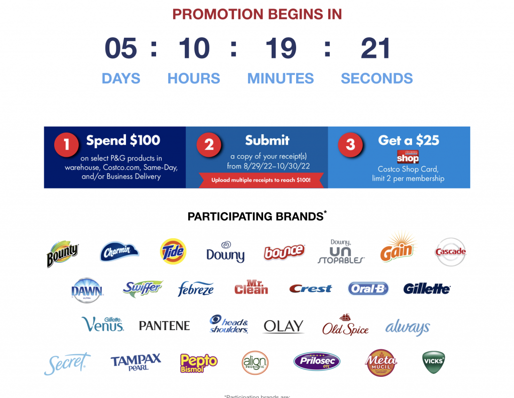 没错它终于来了,有没有小伙伴和小编一样每年都在等这个活动,每次这个活动都是囤一年的量,Costco P&G品牌大促 满$100 送$25礼品卡,每位会员可以使用2次。最多可以得$50礼品卡,一次可以上传多个小票,总额超过$100就可以,特别提醒一定是税前超过$100。Costco现有宝洁品牌商品超过70+,具体对应的品牌请看下图。活动8/29-9/29/22