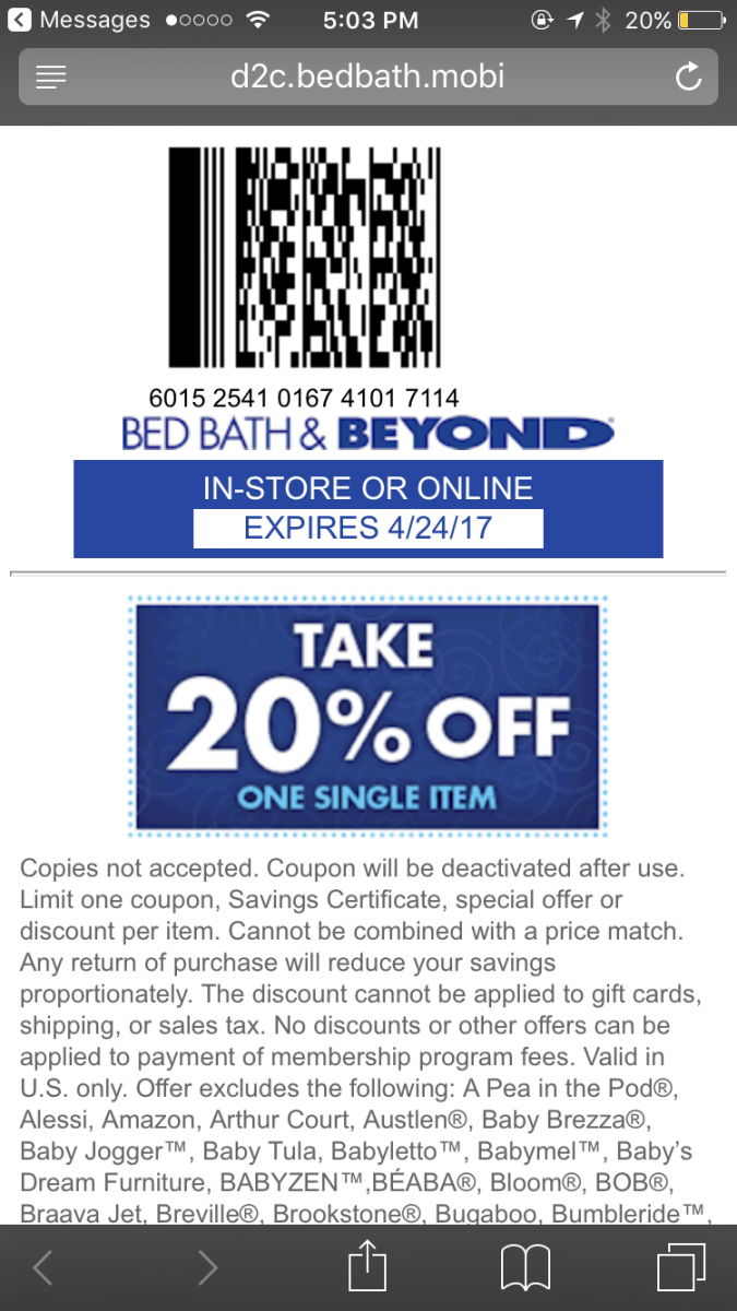 Bed Bath Beyond 实体店折扣 Bed Bath Beyond 额外20%off 实体店和官网通用 4/24/2017到期 2017年4月6日2018年4月25日 小编4号 0 Comments Bed Bath Beyond 额外8折 实体店和官网通用 购物时请出示优惠券 在网上购物记得要用返利网