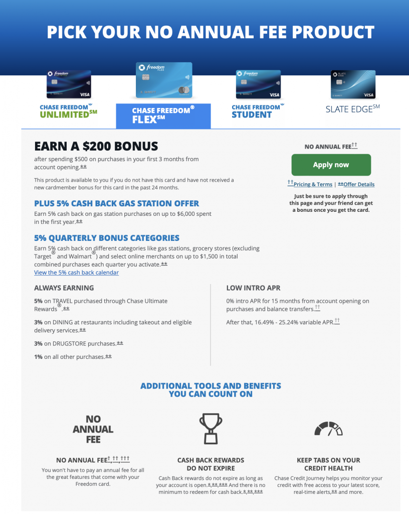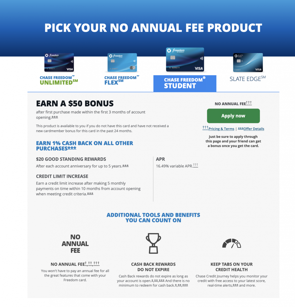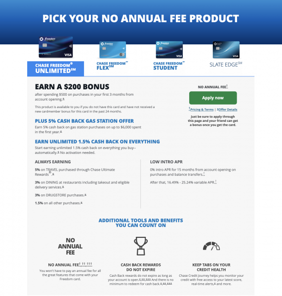 Chase 无年费信用卡,消费还能赚翻点,前两张卡,前三个月消费满$500免费送$200,开卡消费比较低,第三张学生卡,前三个月只要用这张卡就送$50,没有最低消费限制。通过链接进入申请,激活优惠。点击对应的卡进行申请,具体每张卡的返现信息在下图。