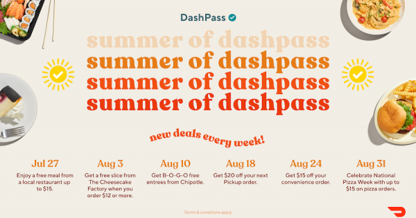 美国生活实用优惠 DoorDash 会员DashPss 八月优惠活动 2020年8月23日2022年9月3日 小编4号 0 Comments doordash, 外卖, 点餐 疫情期间大家少不了店外卖,你们最喜欢用哪家外卖软件点外卖呢?小编最喜欢使用DoorDash ,因为小编认为他家的优惠最好,优惠活动更多,新会员点击注册领取$15优惠哟 下面是8月份他家的优惠活动时间表。