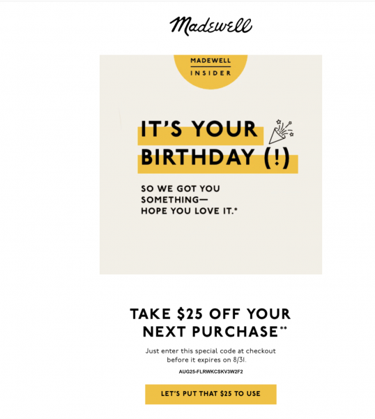 美国生活实用优惠 Madewell 每年送$25 优惠 2022年8月5日2022年9月2日 小编4号 0 Comments madewell, 购物 Madewell 每年生日当月送$25 优惠,注册会员免运费。一定要把生日写进去。这个优惠券可以用在任意产品上,并且可以和其它优惠券叠加使用。