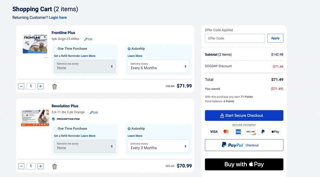 PetMeds美国知名的宠物医药品专卖店,上面有狗狗和猫处方药和非处方药,8/25-8/26 日两日,需要Autoship 这样子才可以使用优惠码:DOGDAY,额外5折,最高减$75,小编尝试了一下,猫的药品也参与打折。TopCashback 额外最高可以返$36.75,新用户返现$36.5,老用户10.5%的返现