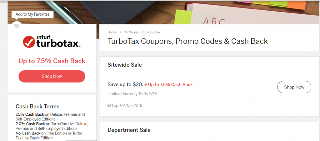 首先进入Ebates 搜索Turbotax最高可以拿到7.5%的返利,最高优惠$20,还没有注册ebates 的用户通过本链接可以额外拿到$10礼品卡